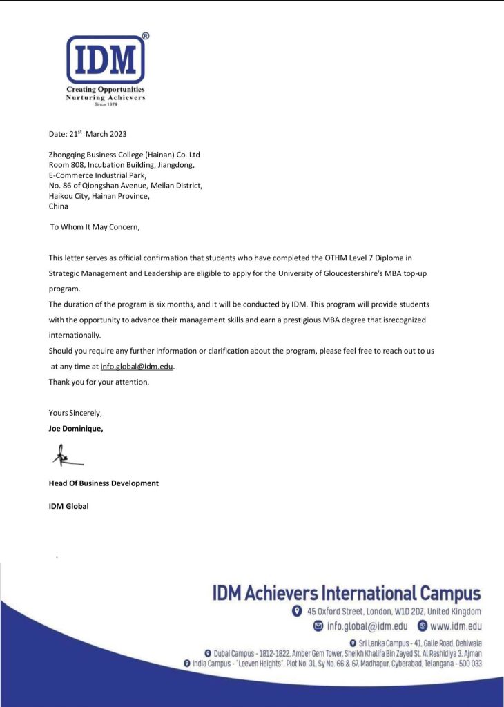 中清商学院(中国:91460000MA5TN3MQ98)英文名:ZHONGQING BUSINESS COLLEGE 是英国OTHM和QUALIFI授权的正规授课中心。我们与新加坡、英国、马来西亚等国家的英联邦大学达成深度战略合作,并在中国成都、绵阳、北京香山、大连等地授权建立战略合作招生与授课中心。我们通过线上平台学习方式把优质的海外课程直接引入到国内,国内学生无需出国便可进行线上学习。灵活的线上授课方式不受时间地域限制,更能节省学习成本。
